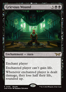 Whenever enchanted player is dealt damage, they lose half their life, rounded up.