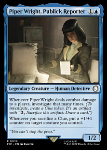 Whenever Piper Wright deals combat damage to a player, investigate that many times. (To investigate, create a Clue token. It's an artifact with "{2}, Sacrifice this token: Draw a card.")