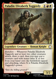 Battalion — Whenever Paladin Elizabeth Taggerdy and at least two other creatures attack, draw a card, then you may put a creature card with mana value X or less from your hand onto the battlefield tapped and attacking, where X is Paladin Elizabeth Taggerdy's power.