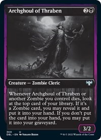 Whenever this creature or another Zombie you control dies, look at the top card of your library. If it's a Zombie card, you may reveal it and put it into your hand. If you don't put the card into your hand, you may put it into your graveyard.
