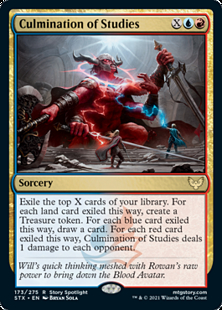 Exile the top X cards of your library. For each land card exiled this way, create a Treasure token. For each blue card exiled this way, draw a card. For each red card exiled this way, Culmination of Studies deals 1 damage to each opponent.