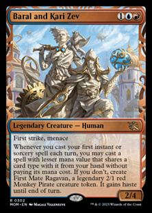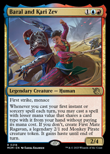 Baral and Kari Zev will count any instant or sorcery spell you cast during a turn, even if it wasn’t on the battlefield at the time. This means if you cast an instant or sorcery spell, then Baral and Kari Zev comes under your control, its triggered ability won’t trigger that turn.