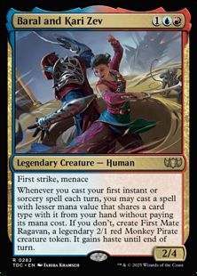 Whenever you cast your first instant or sorcery spell each turn, you may cast a spell with lesser mana value that shares a card type with it from your hand without paying its mana cost. If you don't, create First Mate Ragavan, a legendary 2/1 red Monkey Pirate creature token. It gains haste until end of turn.