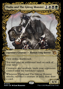 The effect of Thalia and The Gitrog Monster’s ability that allows you to play an additional land is cumulative with similar effects. For example, if you control Thalia and The Gitrog Monster and another permanent with that ability, you’ll be able to play three lands during each of your turns.