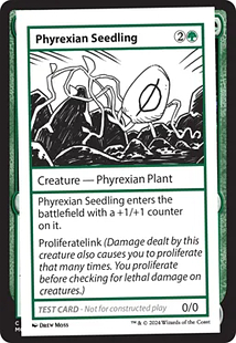 Because proliferatelink lets you proliferate before checking for lethal damage on creatures, Phyrexian Seedling (and other creatures you control with +1/+1 counters on them) may be able to survive combat damage that would otherwise be lethal. For example, if a Phyrexian Seedling with one +1/+1 counter on it attacks and is blocked by a 1/1 creature, it would deal 1 damage to that creature and take 1 damage from that creature. Before checking for lethal damage, the Seedling’s controller would proliferate one time and could choose give the Seedling another +1/+1 counter. Then when state-based actions are checked, the Seedling would be a 2/2 with 1 damage marked on it and would survive.