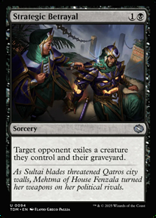 The opponent chooses which creature to exile as Strategic Betrayal resolves. If they don’t control any creatures at that time, they simply exile their graveyard.