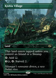 You must already control an Island or a Swamp as Kishla Village enters for it to enter untapped. If it enters at the same time as an Island or Swamp when you control no other Islands or Swamps, it will enter tapped.