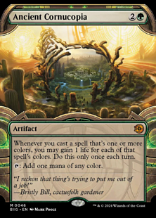 Ancient Cornucopia’s triggered ability counts the number of colors the spell has (from one to five), not how many colored mana symbols there are in its mana cost or how many colors of mana you spent.
