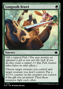 If the creature you control is an illegal target as Longstalk Brawl tries to resolve, you won’t put a +1/+1 counter on it even if the gift was promised. If that creature is a legal target but the creature you don’t control isn’t, you’ll still put a +1/+1 counter on the creature you control if the gift was promised.