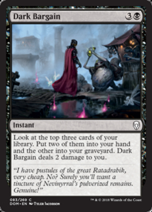 Look at the top three cards of your library. Put two of them into your hand and the other into your graveyard. Dark Bargain deals 2 damage to you.