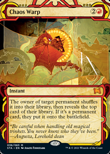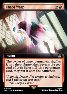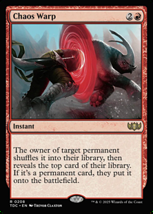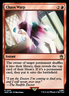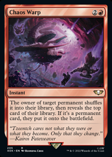 If the permanent is an illegal target by the time Chaos Warp tries to resolve, it won't resolve and none of its effects will occur. No library will be shuffled and no card will be revealed.