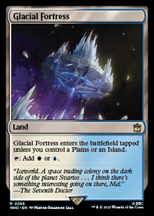 This checks for lands you control with the land type Plains or Island, not for lands named Plains or Island. The lands it checks for don't have to be basic lands. For example, if you control Watery Grave (a nonbasic land with the land types Island and Swamp), Glacial Fortress will enter untapped.