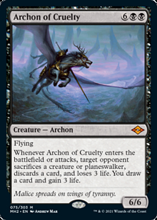 Whenever this creature enters or attacks, target opponent sacrifices a creature or planeswalker of their choice, discards a card, and loses 3 life. You draw a card and gain 3 life.
