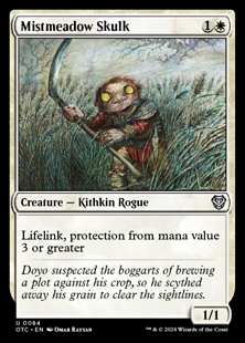 The protection ability means the following: - Mistmeadow Skulk can't be blocked by creatures with mana value 3 or greater. - Mistmeadow Skulk can't be enchanted by Auras with mana value 3 or greater. It also can't be equipped by Equipment with mana value 3 or greater. - Mistmeadow Skulk can't be targeted by spells with mana value 3 or greater. It also can't be targeted by abilities from sources with mana value 3 or greater. - All damage that would be dealt to Mistmeadow Skulk by sources with mana value 3 or greater is prevented.