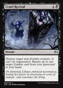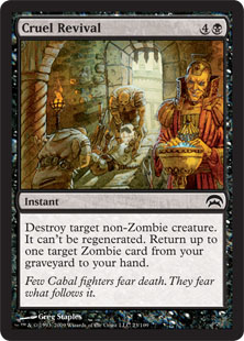 Destroy target non-Zombie creature. It can't be regenerated. Return up to one target Zombie card from your graveyard to your hand.