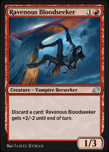 You can activate Ravenous Bloodseeker's ability any number of times to discard several cards. It will be put into its owner's graveyard once its toughness is 0 or less. Any other instances of the ability still on the stack will resolve with no effect.
