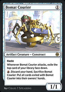 If Bomat Courier leaves the battlefield before you activate its last ability, any cards exiled by its triggered ability remain exiled face down for the rest of the game. If you somehow return the same Bomat Courier card to the battlefield, it will be a different object with no connection to those face-down cards.