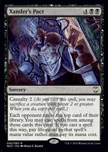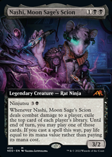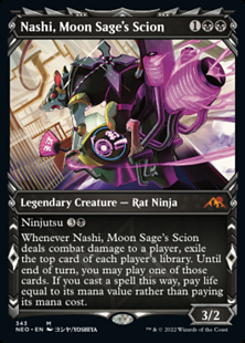 Whenever Nashi deals combat damage to a player, exile the top card of each player's library. Until end of turn, you may play one of those cards. If you cast a spell this way, pay life equal to its mana value rather than paying its mana cost.