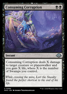 Consuming Corruption deals X damage to target creature or planeswalker and you gain X life, where X is the number of Swamps you control.
