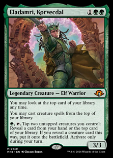 Because you never "cast" a land card, Eladamri, Korvecdal doesn't allow you to play a land creature (such as Dryad Arbor) from the top of your library.