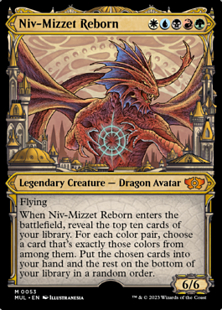 When Niv-Mizzet enters, reveal the top ten cards of your library. For each color pair, choose a card that's exactly those colors from among them. Put the chosen cards into your hand and the rest on the bottom of your library in a random order.