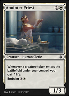 If Anointer Priest enters the battlefield at the same time as a creature token, its ability triggers for that other creature. For example, if you control Anointed Procession and embalm Anointer Priest, the triggered ability of each one triggers twice and you gain a total of 4 life.