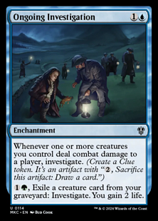 Whenever one or more creatures you control deal combat damage to a player, investigate. (Create a Clue token. It's an artifact with "{2}, Sacrifice this token: Draw a card.")