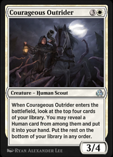 When this creature enters, look at the top five cards of your library. You may reveal a Mount creature card or a Plains card from among them and put it into your hand. Put the rest on the bottom of your library in a random order.