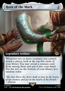 Two or more creatures you control must attack the same player in order for Horn of the Mark's ability to trigger. Creatures you control that attack planeswalkers that player controls or battles that player is protecting won't count toward Horn of the Mark's trigger condition.