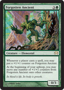 Forgotten Ancient's first ability will resolve before the spell that caused it to trigger. Putting a +1/+1 counter on Forgotten Ancient is optional.