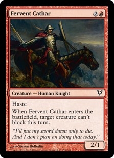 The targeted creature can’t block any creatures this turn. The effect doesn’t merely restrict whether it can block Fervent Cathar.
