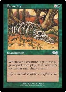 In a multiplayer game, if a player loses the game, triggered abilities that player controls are removed from the stack and no more from that player can be added. This means that if a creature an opponent controls dies while you control Fecundity, and you lose the game before Fecundity’s triggered ability resolves (perhaps because you lost the game at the same time that the creature died), that player won’t draw a card.
