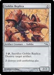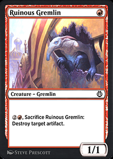 {R}, Sacrifice this creature: Destroy target artifact.