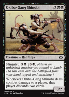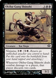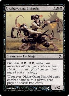If the defending player has two or fewer cards in hand when Okiba-Gang Shinobi deals combat damage to that player, they are all discarded.