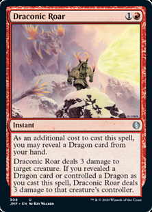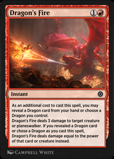 Dragon's Fire deals 3 damage to target creature or planeswalker. If you revealed a Dragon card or chose a Dragon as you cast this spell, Dragon's Fire deals damage equal to the power of that card or creature instead.