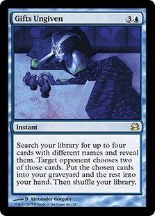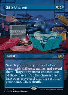 Search your library for up to four cards with different names and reveal them. Target opponent chooses two of those cards. Put the chosen cards into your graveyard and the rest into your hand. Then shuffle.
