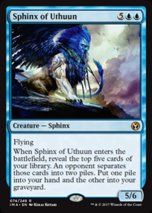 When this creature enters, reveal the top five cards of your library. An opponent separates those cards into two piles. Put one pile into your hand and the other into your graveyard.