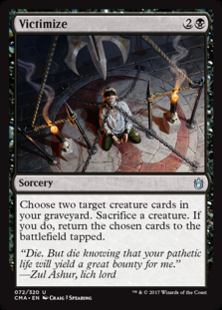 You must choose two targets. You can't cast Victimize targeting only one creature card.