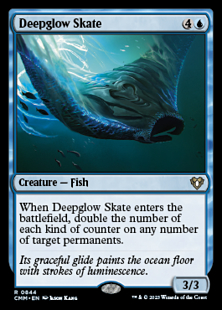 As Deepglow Skate's ability resolves, you must double each kind of counter on the permanents it targets.