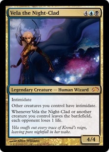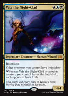 Whenever Vela or another creature you control leaves the battlefield, each opponent loses 1 life.