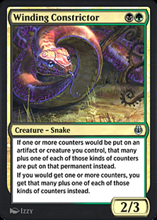 If a nonartifact, noncreature permanent (such as a planeswalker) would enter the battlefield with counters on it and become an artifact or a creature on the battlefield due to another card's effect (such as that of Mycosynth Lattice), Winding Constrictor's effect will give that permanent another of those counters.
