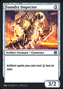 If an artifact spell has {X} in its mana cost, choose the value for X first, and then reduce the cost by {1}. For example, an artifact that costs {X} with X chosen as 4 costs {3} to cast if you control Foundry Inspector.