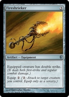 Equipped creature has double strike. (It deals both first-strike and regular combat damage.)