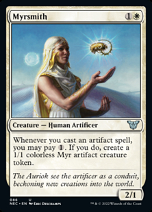 Whenever you cast an artifact spell, you may pay {1}. If you do, create a 1/1 colorless Myr artifact creature token.