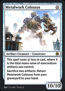 If the total mana value of noncreature artifacts you control is 11 or greater, Metalwork Colossus costs {0} to cast.