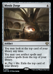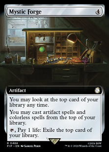 Because you never "cast" a land card, Mystic Forge doesn't allow you to play an artifact land from the top of your library.